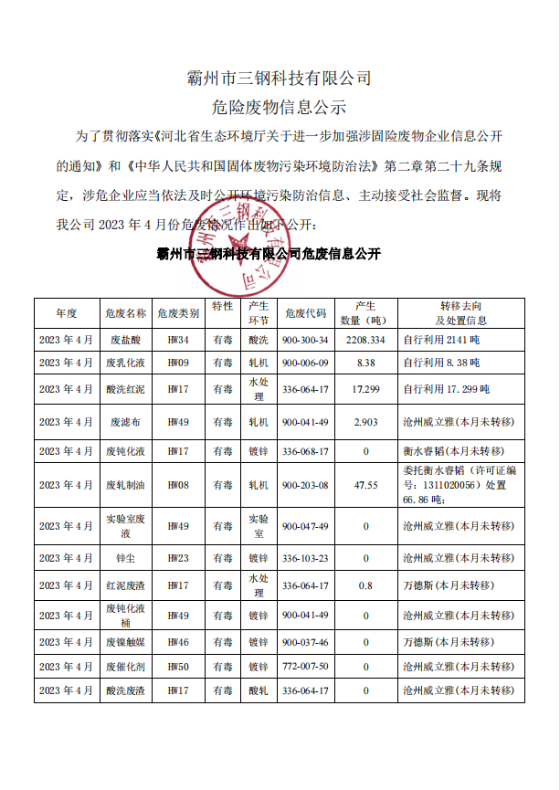 霸州市三鋼科技有限公司 4月份危險(xiǎn)廢物信息公示