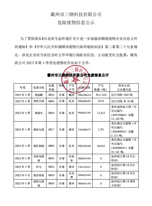 霸州市三鋼科技有限公司 危險(xiǎn)廢物信息公示