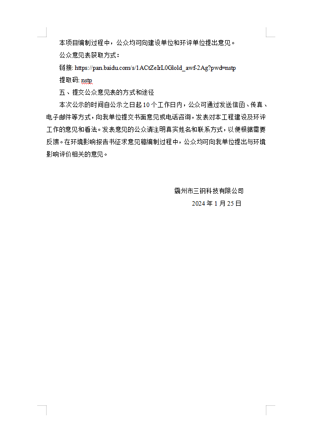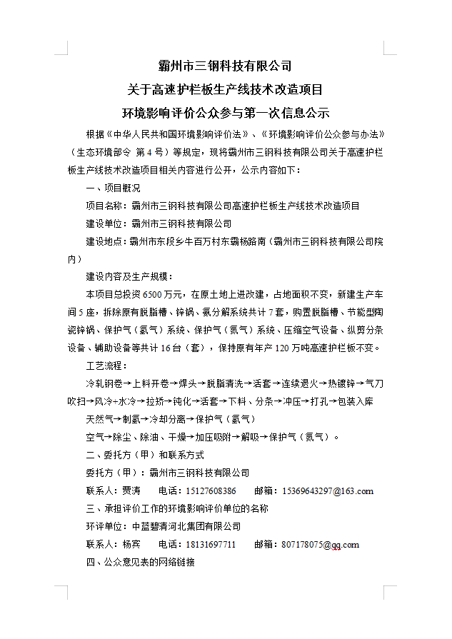 霸州市三鋼科技有限公司 關于高速護欄板生產線技術改造項目 環(huán)境影響評價公眾參與第一次信息公示